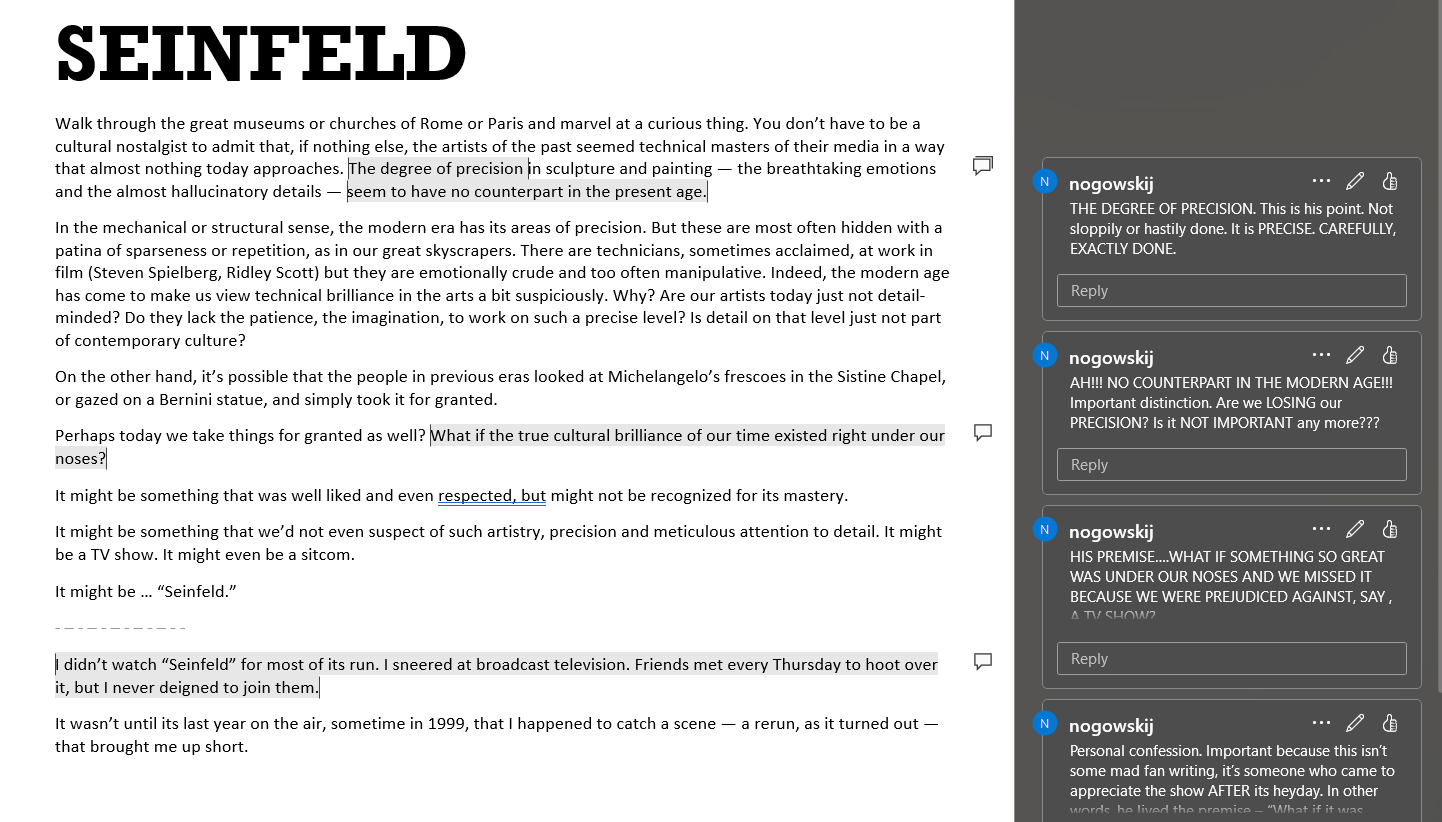 What in the world did we talk about? What was the experience of a class on Seinfeld like? I’ve downloaded Wyman’s entire article and my annotations for you, just like we were in class and ready to discuss. (Here’s just a small sample)